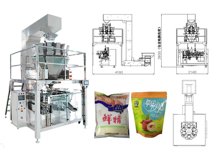 Features: 1. Bag placing structure 2. Bag feeding device 3. Automatic bag loading device 4. Manipulator gripping bag 5. Vacuum bag opening 6. Filling material 7. Shaping 8. Sealing 9. Finished product conveying.