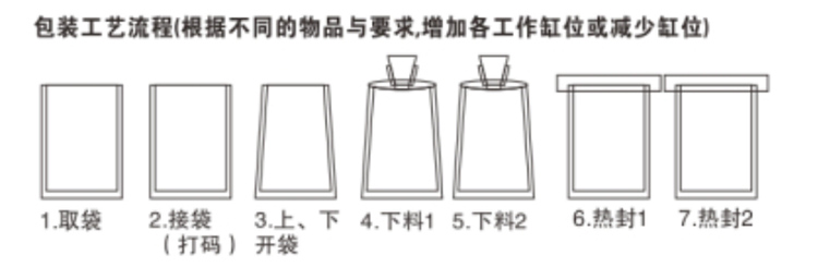 特點:1、放袋結構 2、送袋裝置 3、自動上袋裝置、 4、機械手夾袋 5、真空開袋 6、充填物料 7、整形 8、封口 9、成品輸送。